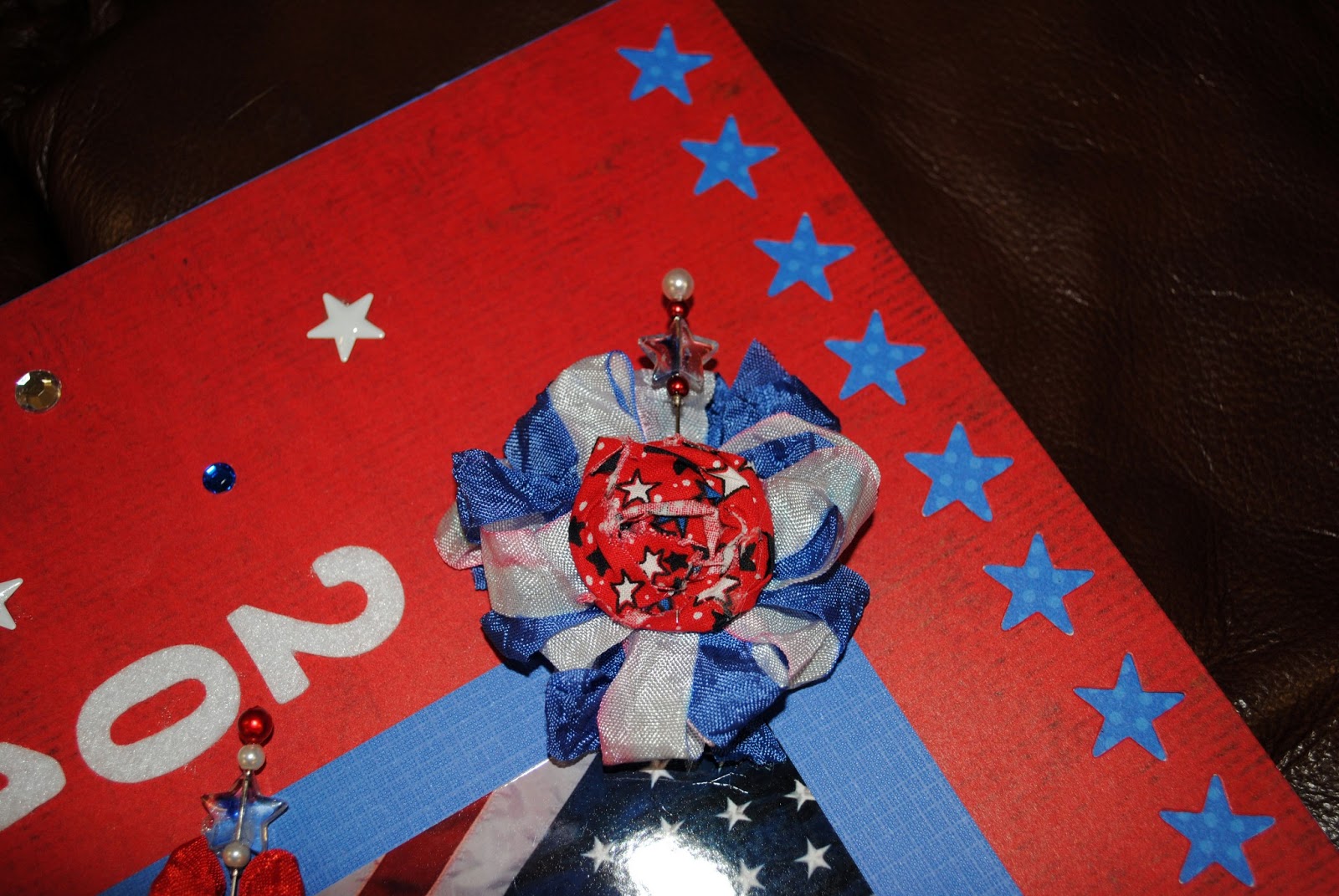 This is a much better shot of the Adorable Patriotic stick pin from Pinque Peacock I used red crinkle ribbon from 3 girl jam and the amazing bow maker from 3 girl jam to make the bow to slip my Patriotic Stick Pin in.